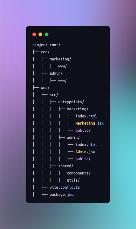 With this setup, multiple React-based services share a single repository to streamline development. Each service has its own entry point, static assets, and build output, while reusable components and utilities live at the same level as the service entrypoints. This arrangement reduces duplication and avoids the overhead of managing separate repositories.