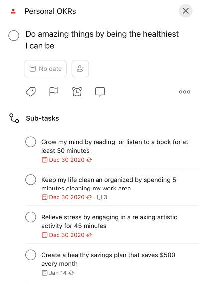 Contrary to its definition, I feel that your personal OKR’s should be extremely personal and should based on your opinions. You are the one setting them and you are the one that needs to hold yourself accountable. It is for your personal gain, so you should be selfish when defining them. For this reason, I felt “Initiatives” was more of a relevant term.