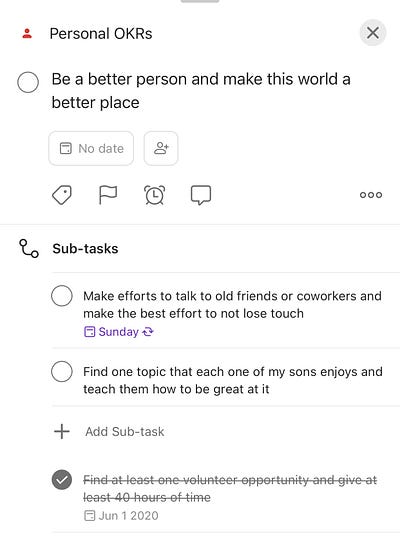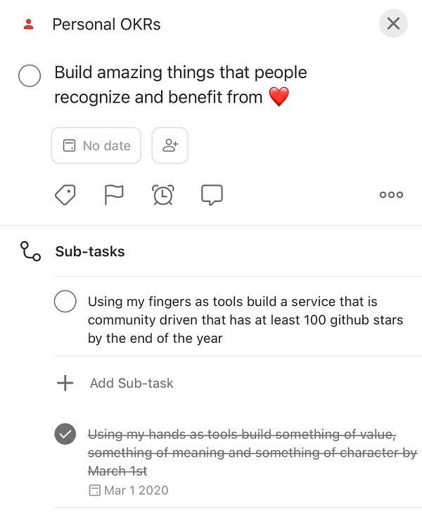 I used what I valued most in life within my formula towards achieving personal happiness when I began my journey of discovering my personal OKR’s. Instead of New Years Resolutions that easily fall to the wayside, I took a different approach, something I was familiar with and something I could use to keep track of my progress and failures. It has kept me grounded. It has given me something to work towards; a successful metric of personal happiness. I am not afraid to hold myself accountable, a practice that took me a while to really understand.